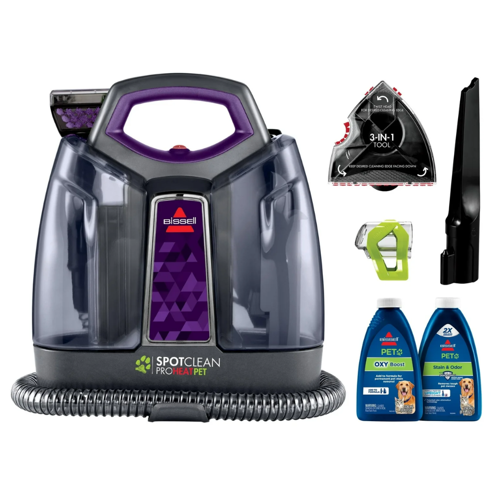 El BISSELL SpotClean ProHeat Pet es un limpiador profundo portátil, compacto y ligero (solo 9 lbs), diseñado para ofrecer una eliminación insuperable de manchas difíciles en alfombras, tapicerías, escaleras, alfombras de área, interiores de automóviles, casas rodantes y más.