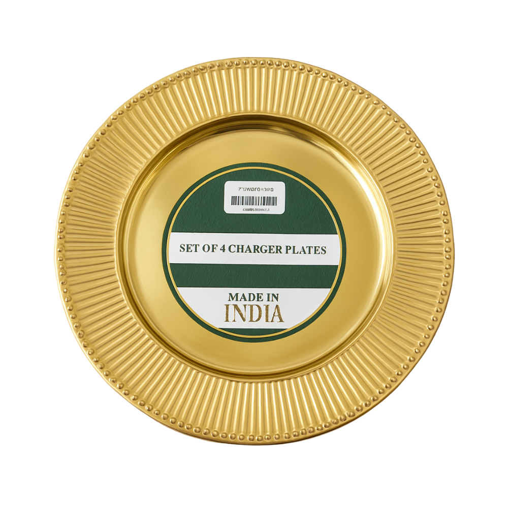 Este elegante set de 4 platos metálicos dorados destaca por su diseño con líneas grabadas que aportan un toque moderno y sofisticado a cualquier mesa. Perfectos para usar como platos base o decorativos, añaden brillo y estilo a cenas festivas, eventos especiales o reuniones familiares.