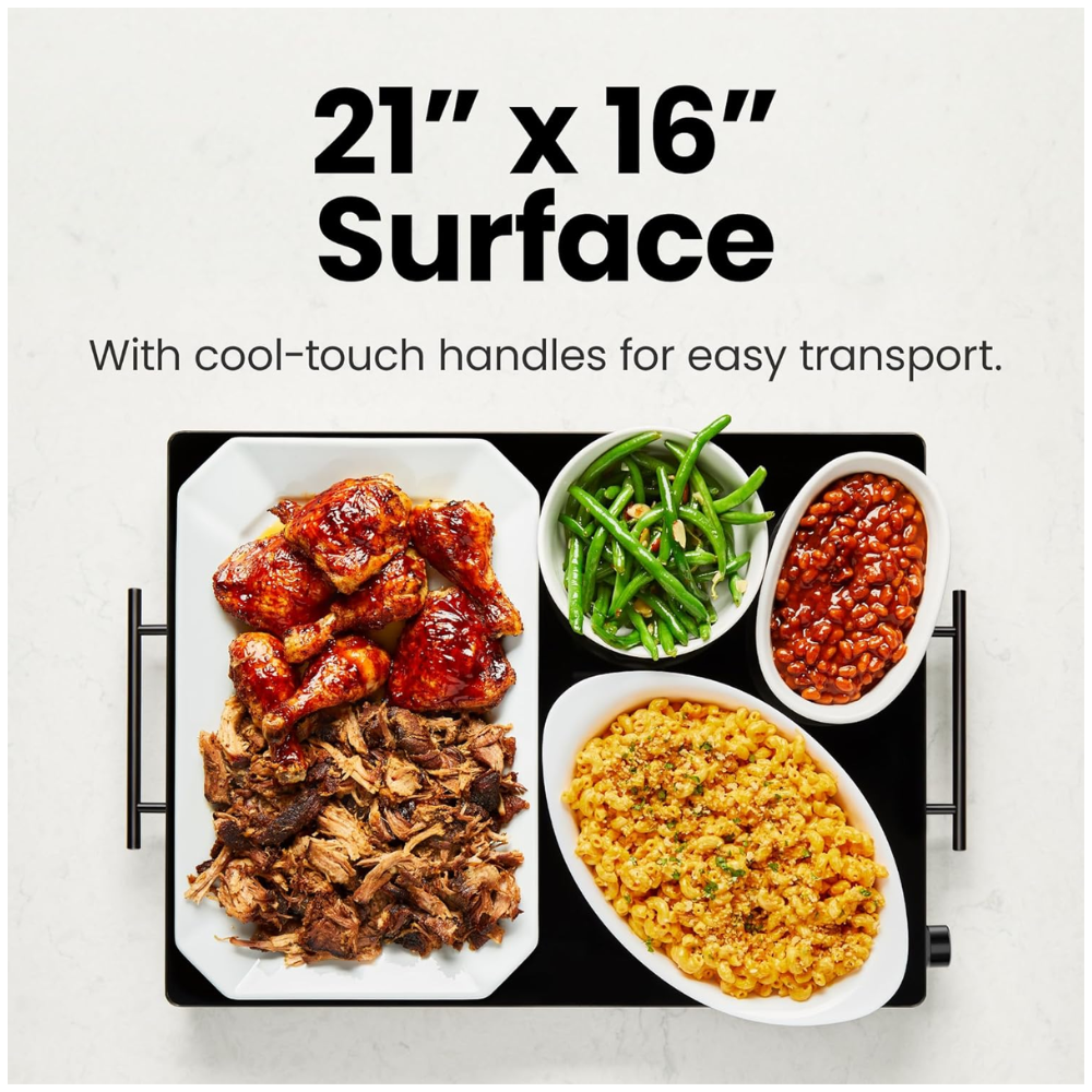 Con una amplia superficie de 21 x 16 pulgadas, permite calentar varios platos simultáneamente, conservando su sabor y textura sin riesgo de sobrecalentamiento ni quemaduras.