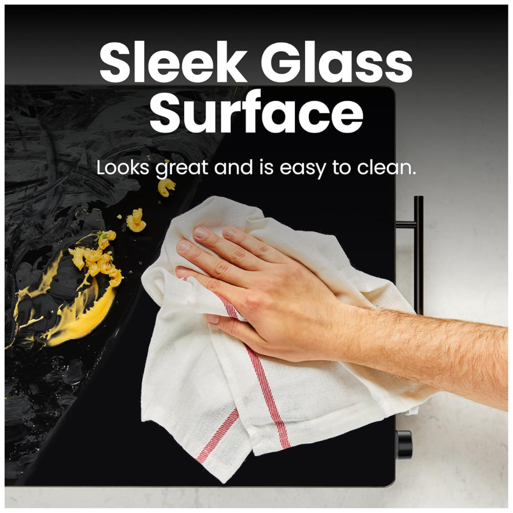 La superficie de vidrio templado negro es elegante, duradera y sencilla de limpiar con un paño húmedo.