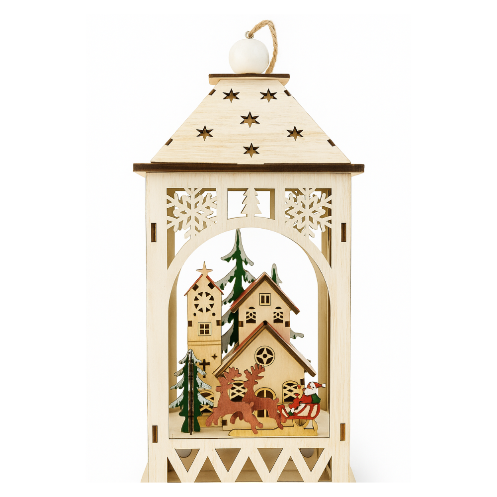 Elaborado con materiales de alta calidad y acabado detallado, su diseño evoca la arquitectura europea clásica, ideal para complementar decoraciones navideñas o de invierno. Puede colocarse en repisas, mesas o centros de mesa para añadir un brillo acogedor y festivo al ambiente.