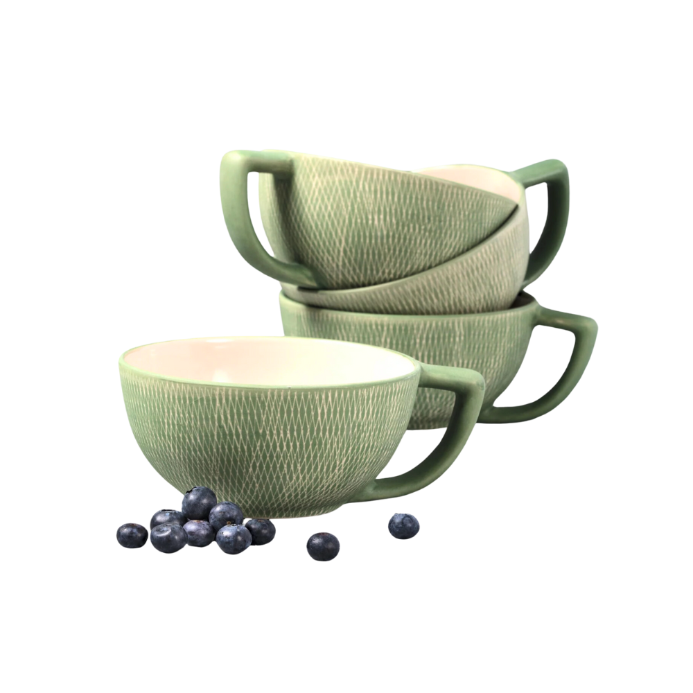 Taza de gres esmaltado en tono jade, con diseño crosshatch texturizado que aporta un estilo moderno y artesanal. Ideal para disfrutar de un latte o cualquier bebida caliente con un toque de elegancia.